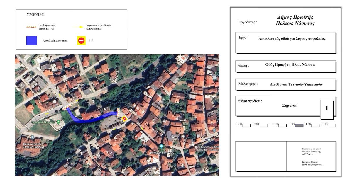 Την απαγόρευση της κυκλοφορίας για πεζούς και οχήματα για λόγους ασφαλείας από το πρωί της Παρασκευής 5 Ιουλίου, τμήματος της οδού Προφήτη Ηλία, από τη διασταύρωση με την οδό Αγία Παρασκευή και για μήκος περίπου 50 μέτρων, μέχρι να αποκατασταθεί, αποφάσισε ο Δήμαρχος του Δήμου Ηρωικής Πόλης Νάουσας κ. Νίκος Κουτσογιάννης.
