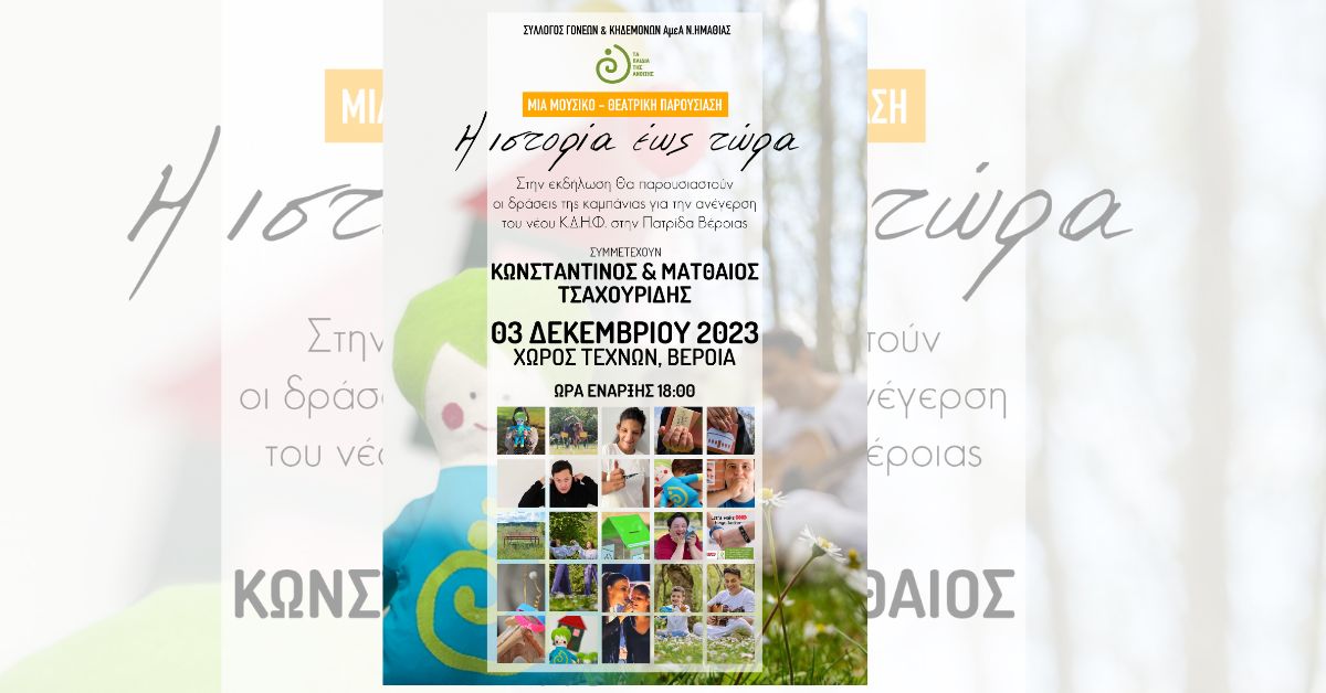 O Σύλλογος Γονέων & Κηδεμόνων ΑμεΑ Ν.Ημαθίας «Τα παιδιά της άνοιξης» διοργανώνει την Κυριακή 03 Δεκεμβρίου 2023 στις 18:00 στο Χώρο Τεχνών στη Βέροια μουσικό – θεατρική παρουσίαση των δράσεων της καμπάνιας για την ανέγερση του νέου Κ.Δ.Η.Φ. ΑμεΑ στην Πατρίδα Ημαθίας με τίτλο «Η ιστορία έως τώρα».