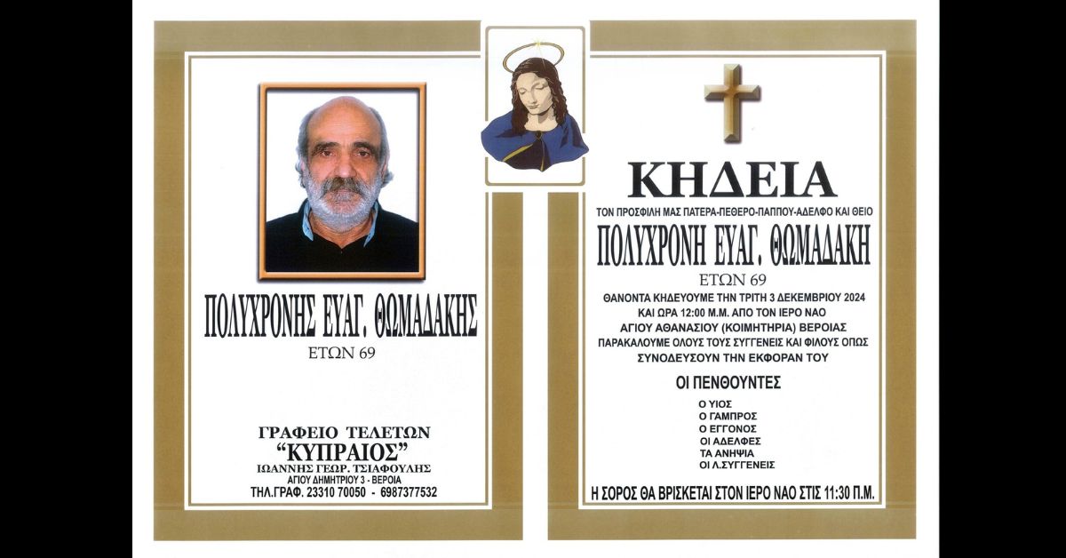 Η κηδεία του θα γίνει την Τρίτη 3 Δεκεμβρίου και ώρα 12:00 από τον Ιερό Ναό Αγίου Αθανασίου Βέροιας.