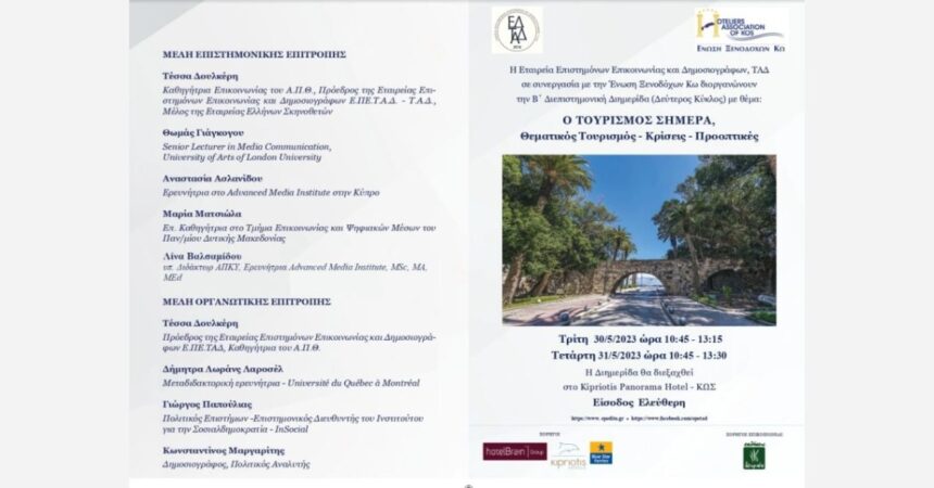 Η Εταιρεία Επιστημόνων Επικοινωνίας και Δημοσιογράφων, Τ.Α.Δ., διοργανώνει στις 30 και 31 Μαΐου στην Κω σε συνεργασία με την Ένωση Ξενοδόχων Κω την διεπιστημονική διημερίδα με θέμα: «O ΤΟΥΡΙΣΜΟΣ ΣΗΜΕΡΑ: Θεματικός Τουρισμός, Κρίσεις, Προοπτικές».