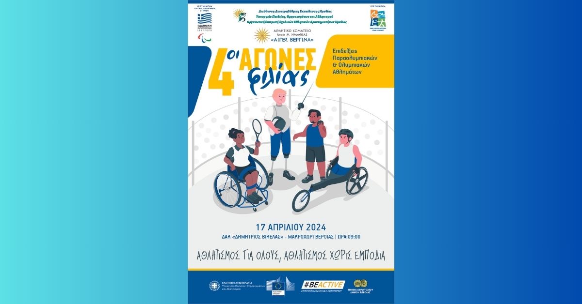 Το ΑΘΛΗΤΙΚΟ ΣΩΜΑΤΕΙΟ ΑμεΑ Ν. ΗΜΑΘΙΑΣ «ΑΙΓΕΣ ΒΕΡΓΙΝΑ», και η Διεύθυνση Δευτεροβάθμιας Εκπαίδευσης Νομού Ημαθίας (Ο.Ε.Σ.Α.Δ. Ημαθίας), διοργανώνουν τους 4ους Αγώνες φιλίας, οι οποίοι Τελούν υπό την αιγίδα της Εθνικής Αθλητικής Ομοσπονδίας Ατόμων με Αναπηρίες και της Ελληνικής Παραολυμπιακής Επιτροπής, με τη στήριξη του Ευρωπαϊκού Προγράμματος Be Active του Υπουργείου Παιδείας Θρησκευμάτων και Αθλητισμού και του Δήμου Βέροιας την Τετάρτη 17 Απριλίου 2024, στο Δ.Α.Κ.. «ΔΗΜΗΤΡΙΟΣ ΒΙΚΕΛΑΣ» Μακροχωρίου από τις 9.00 π.μ. έως τις 13:30 μ.μ .