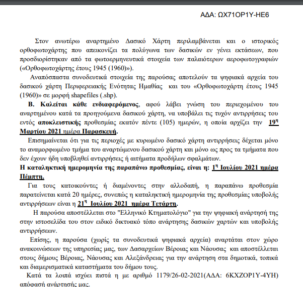 1η ανακρίβεια: Η ανάρτηση του δασικού χάρτη της Περιφερειακής Ενότητας Ημαθίας δεν έγινε το 2017. Έγινε τον Μάρτιο του έτους 2018.