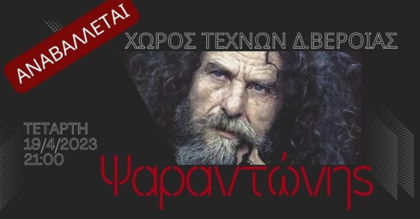 H Kostello’s Events ενημερώνει ότι η προγραμματισμένη συναυλία του ΨΑΡΑΝΤΩΝΗ για την Τετάρτη 19/4/2023 στον Χώρο Τεχνών Δ. Βέροιας αναβάλλεται και θα γίνει σύντομα ενημέρωση για τη νέα ημερομηνία διεξαγωγής.