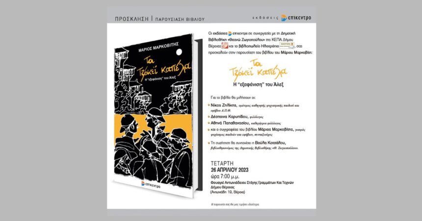 Η Δημοτική βιβλιοθήκη «Θ. Ζωγιοπούλου» της ΚΕΠΑ Δήμου Βέροιας, οι εκδόσεις Επίκεντρο και το βιβλιοπωλείο Ηλιοτρόπιο σας προσκαλούν στην παρουσίαση του βιβλίου του Μάριου Μαρκοβίτη «Τα τζόκεϊ καπέλα : Η “εξαφάνιση” του Αλέξ», την Τετάρτη 26 Απριλίου στις 7 μ.μ. στο Φουαγιέ της Αντωνιάδειου Στέγης Γραμμάτων και Τεχνών.