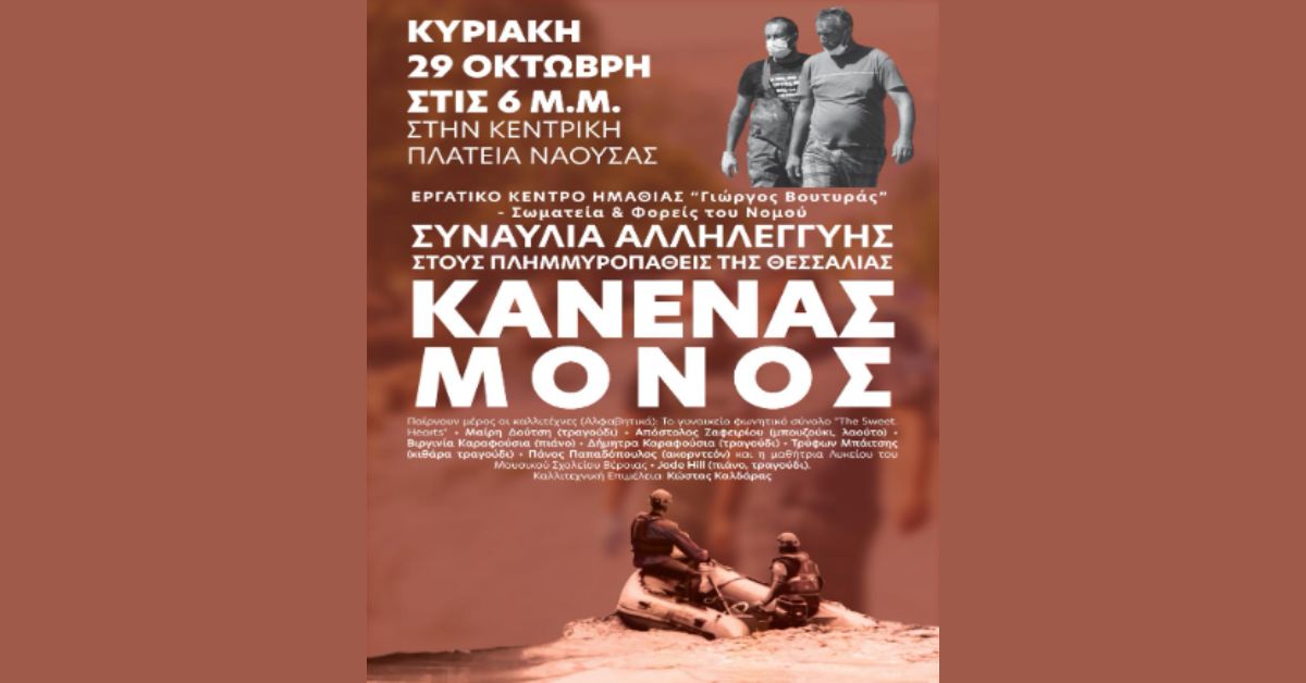 Μεγάλη συναυλία αλληλεγγύης προς τους πλημμυροπαθείς της Θεσσαλίας πραγματοποιεί το Εργατικό Κέντρο Ημαθίας , σωματεία και φορείς του Νομού την Κυριακή 29 Οκτώβρη στις 6μμ στη Κεντρική Πλατεία Νάουσας με τη συμμετοχή σημαντικών καλλιτεχνών του Νομού μας.