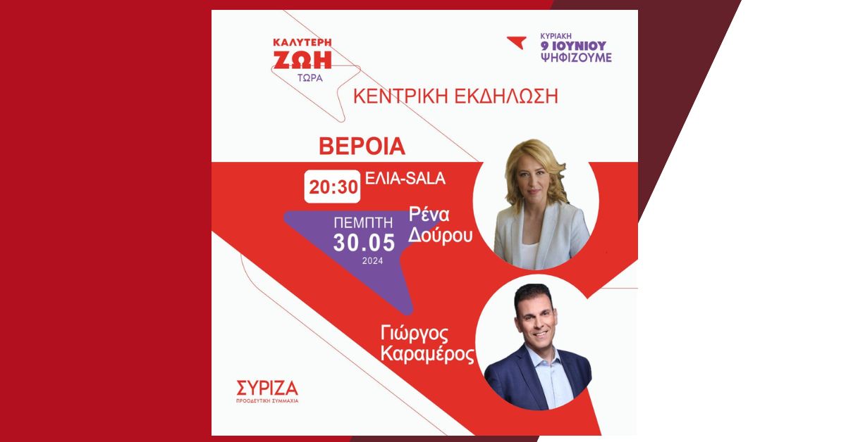 Βέροια: Κεντρική εκδήλωση του ΣΥΡΙΖΑ με ομιλητές τη Ρένα Δούρου και τον Γιώργο Καραμέρο (30/5/24)