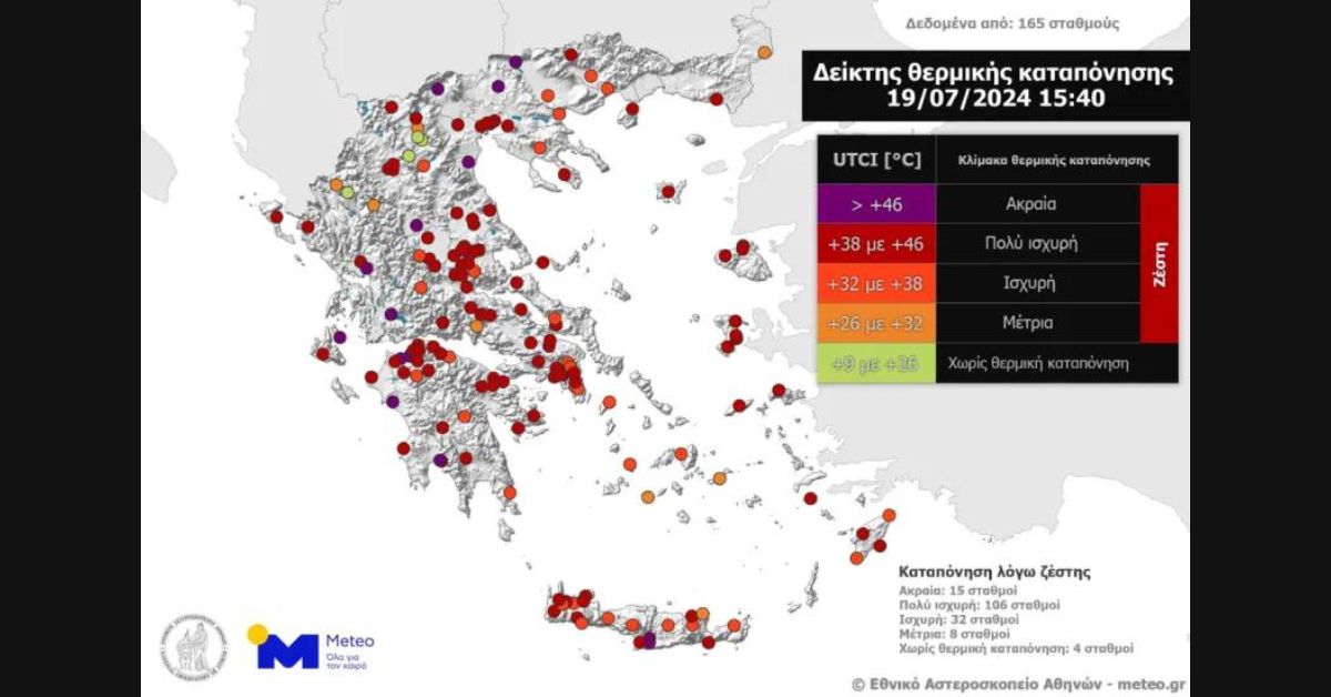 Σύμφωνα με το meteo –που παρουσιάζει τη θερμική καταπόνηση σε περιοχές δεκάδων επιλεγμένων μετεωρολογικών σταθμών– η καταπόνηση χαρακτηρίστηκε ως «πολύ ισχυρή» σε 106 σταθμούς και «ακραία» σε άλλους 15. Το συνολικό ποσοστό σταθμών με «πολύ ισχυρή» ή «ακραία» θερμική καταπόνηση ήταν περίπου 73%.
