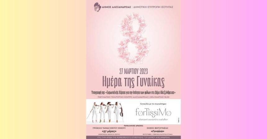 Ο Δήμος Αλεξάνδρειας και η Δημοτική Επιτροπή Ισότητας σας προσκαλούν στις Εκδηλώσεις για την ημέρα της Γυναίκας, τη Δευτέρα 27 Μαρτίου στο Πνευματικό Κέντρο Αλεξάνδρειας.