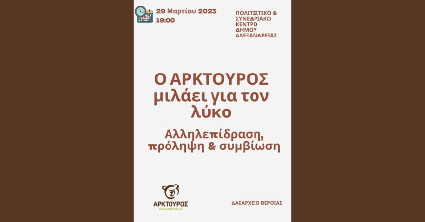 Το Δασαρχείο Βέροιας σας προσκαλεί στην ενημερωτική εκδήλωση που συνδιοργανώνει με την περιβαλλοντική οργάνωση ΑΡΚΤΟΥΡΟΣ με θέμα: «Ο ΑΡΚΤΟΥΡΟΣ μιλάει για τον λύκο. Αλληλεπίδραση, πρόληψη & συμβίωση», την Τετάρτη 29 Μαρτίου 2023 και ώρα 19.00 στο Πολιτιστικό και Συνεδριακό Κέντρο του Δήμου Αλεξάνδρειας.