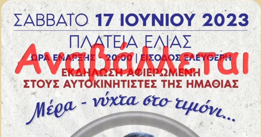 Η συνεχιζόμενη αστάθεια του καιρού την τρέχουσα εβδομάδα, με βροχές και καταιγίδες στην περιοχή μας θα συνεχιστεί, με τις τελευταίες μετεωρολογικές προγνώσεις της Ε.Μ.Υ., να κάνουν λόγο για έντονα καιρικά φαινόμενα μέχρι και το επόμενο Σαββατοκύριακο, γεγονός που καθιστά αδύνατη την πραγματοποίηση της εκδήλωσης-αφιέρωμα στον Ημαθιώτη οδηγό, με διοργανωτή την Π.Ε. Ημαθίας, που είχε προγραμματιστεί για το Σάββατο 17 Ιουνίου 2023, στην Πλατεία Ελιάς.