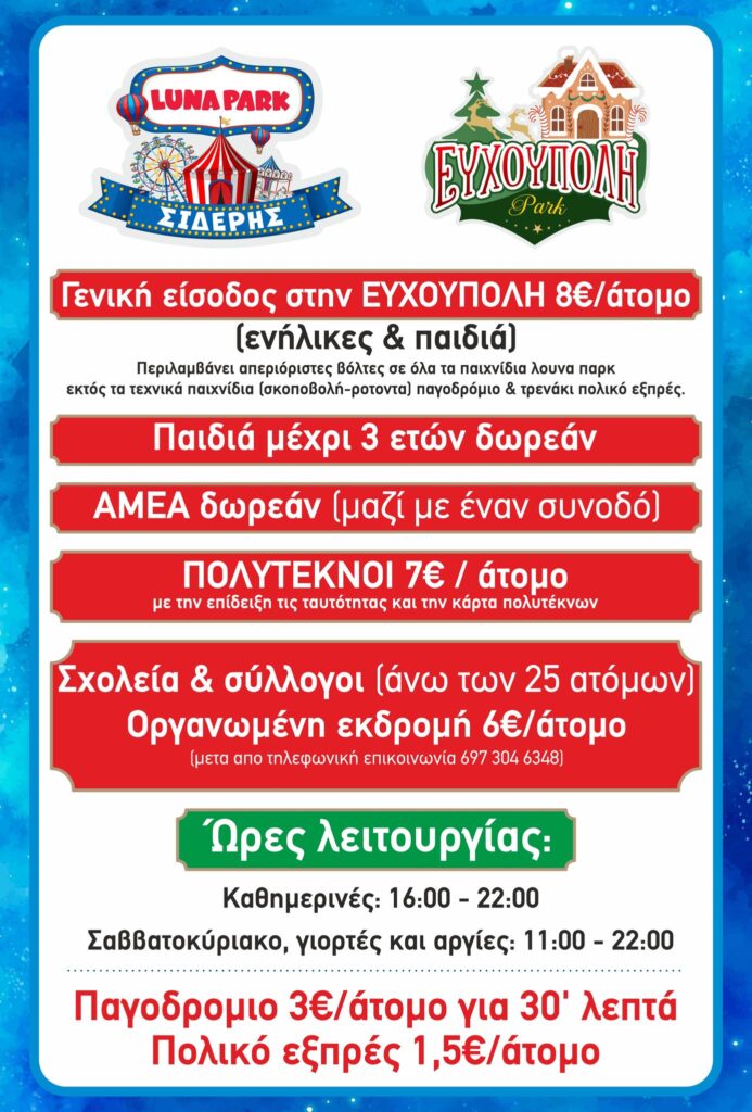 ΕΙΣΟΔΟΣ 8 ΕΥΡΩ με απεριόριστες βόλτες όλη μέρα με ένα μικρό τίμημα των 3 ευρώ τη μισή ώρα για το παγοδρόμιο και 1.5 ευρώ για το τρενάκι που θα κάνει βόλτες τους μικρούς και μεγάλους φίλους μέσα στο Χριστουγεννιάτικο Χωριό.