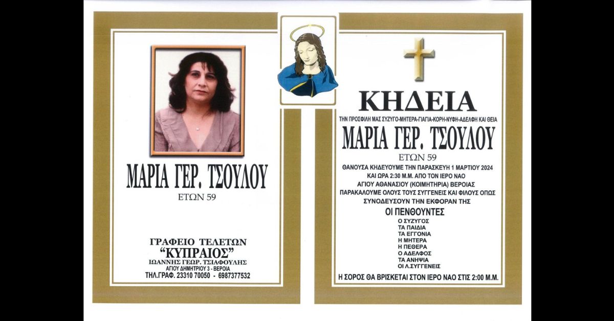 Η κηδεία της θα γίνει την Παρασκευή 1 Μαρτίου και ώρα 2:30μ.μ. από τον Ι. Ν. Αγίου Αθανασίου (Κοιμητήρια) Βέροιας.