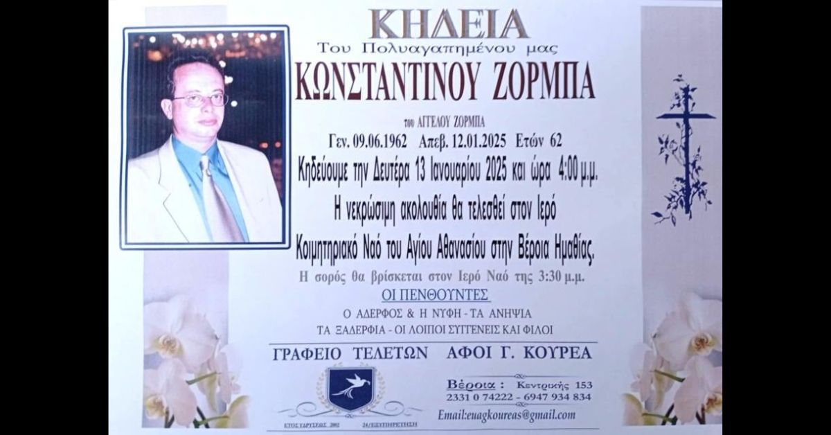 Σε ηλικία 62 ετών άφησε την τελευταία του πνοή ο Κωνσταντίνος Ζορμπάς.