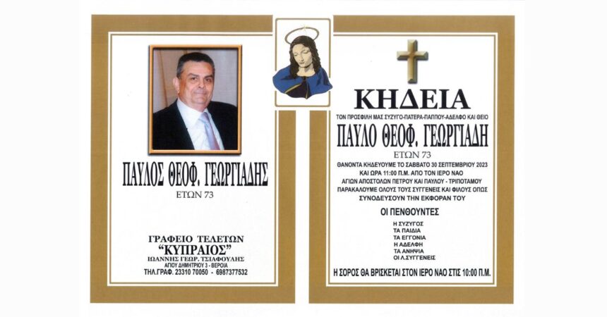 Σε ηλικία 73 ετών απεβίωσε ο Παύλος Γεωργιάδης.