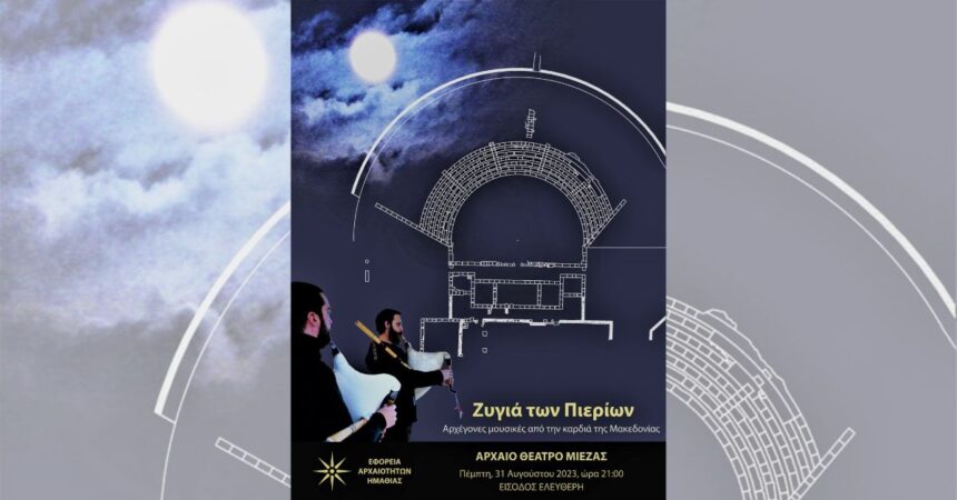 Την Πέμπτη, 31 Αυγούστου, σας καλούμε στο αρχαίο θέατρο της Μίεζας… Στο φως του φεγγαριού, η Ζυγιά των Πιερίων, ο Δημήτρης Τσιγγενόπουλος, ο Στέφανος Μπάμπαλος και ο Νίκος Μελιτζανάς, με γκάιντες, φλογέρες και τύμπανα θα μας ταξιδέψει στις αρχέγονες μουσικές της Μακεδονικής γης και στις διονυσιακές ρίζες του αρχαίου δράματος…