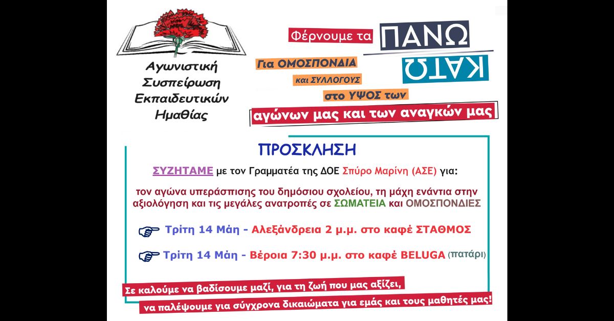 ΑΣΕ – ΠΑΜΕ Ημαθίας: Πρόσκληση σε συζήτηση με τον Γραμματέα της ΔΟΕ Σπύρο Μαρίνη (ΑΣΕ) σε Αλεξάνδρεια και Βέροια (14/5/24)