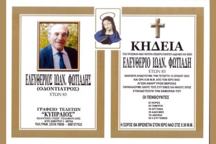 Σε ηλικία 83 ετών έφυγε από τη ζωή ο οδοντίατρος Ελευθέριος Φωτιάδης.…