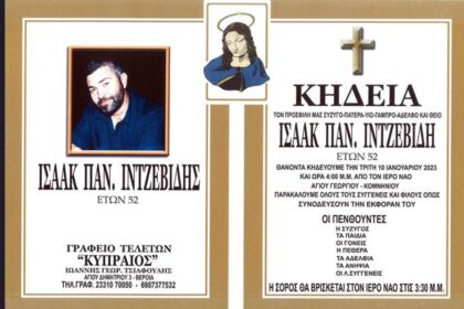 Σήμερα Τρίτη 10 Ιανουαρίου 2023 και ώρα 16:00 θα γίνει η κηδεία…