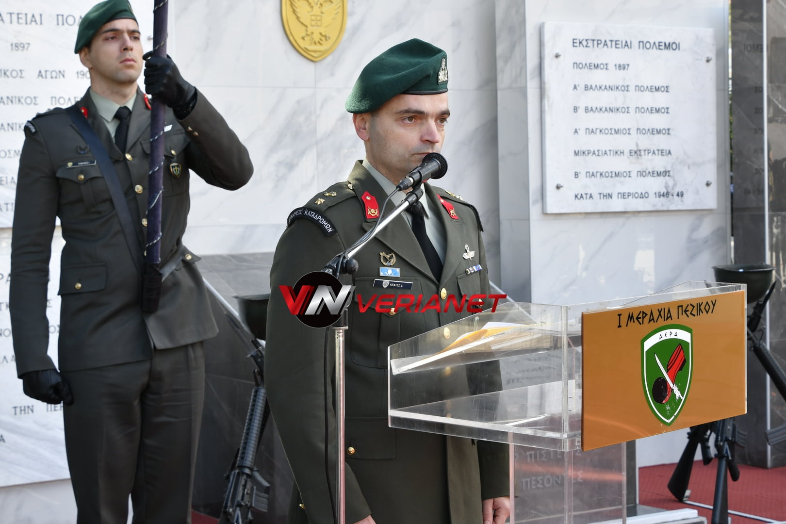 Υποκλίνοµαι ευλαβικά στις Πολεµικές Σηµαίες των Σχηµατισµών και Μονάδων της Μεραρχίας και αποτίω φόρο Τιµής κι ευγνωµοσύνης στους ηρωικώς πεσόντες για την Πατρίδα, αλλά και τους πεσόντες εν υπηρεσία στην ειρήνη.
