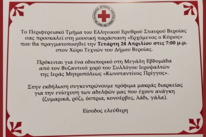 “Ερχόμενος ο Κύριος” – Μουσική παράσταση από το Περιφερειακό Τμήμα Ελληνικού Ερυθρού Σταυρού Βέροιας (24/4/24)