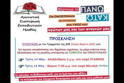 ΑΣΕ – ΠΑΜΕ Ημαθίας: Πρόσκληση σε συζήτηση με τον Γραμματέα της ΔΟΕ Σπύρο Μαρίνη (ΑΣΕ) σε Αλεξάνδρεια και Βέροια (14/5/24)
