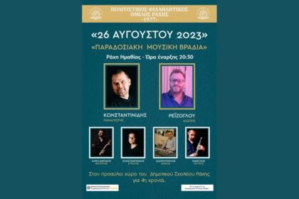 Παραδοσιακή μουσική βραδιά διοργανώνει ο Πολιτιστικός Φιλαθλητικός Όμιλος Ράχης (26/8/23)