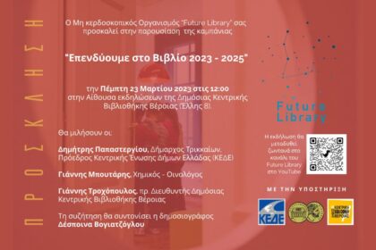 Βέροια: «Επενδύουμε στο Βιβλίο 2023 – 2025» – Δωρεάν ανοικτή πρόσβαση για όλους και όλες στον κόσμο του βιβλίου από τo Future Library (23/3/23)