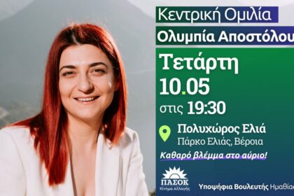 Ολυμπία Αποστόλου: Σήμερα Τετάρτη 10 Μαϊου η Κεντρική Προεκλογική Ομιλία στη Βέροια