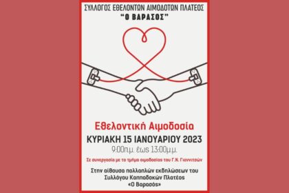 10η εθελοντική αιμοδοσία από τον Σύλλογο Εθελοντών Αιμοδοτών Πλατέος Ημαθίας “Ο Βαρασός” (15/1/23)