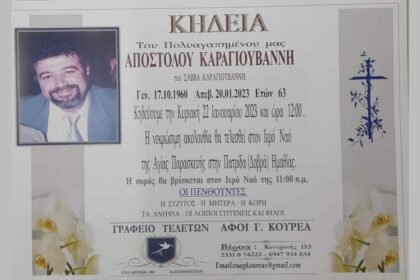 Στις 12 το μεσημέρι της Κυριακής 21 Ιανουαρίου θα τελεστεί η κηδεία…