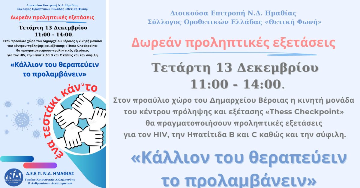Η ΔΕΕΠ Ημαθίας, μέσω του Τομέα Κοινωνικής Αλληλεγγύης και Ανθρωπίνων Δικαιωμάτων, την Τετάρτη 13/12/2023 και ώρες 11:00 με 14:00 θα υλοποιήση μία δράση με τίτλο: «Κάλλιον του θεραπεύειν το προλαμβάνειν» με σκοπό την πρόληψη, την ευαισθητοποίηση και την ενημέρωσης της κοινότητας για τα μεταδοτικά νοσήματα.