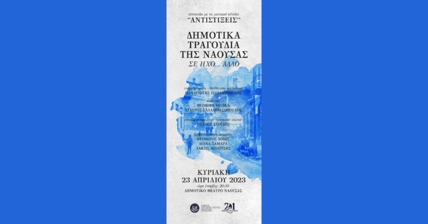 Στο πλαίσιο των εκδηλώσεων της 201ης Επετείου Ολοκαυτώματος της πόλης, ο Δήμος Ηρωικής Πόλης Νάουσας διοργανώνει συναυλία «Δημοτικά τραγούδια της Νάουσας σε ήχο… άλλο» με το μουσικό σύνολο “Αντιστίξεις” την Κυριακή 23 Απριλίου και ώρα 20:30 στο Δημοτικό Θέατρο Νάουσας “Μίκης Θεοδωράκης”.