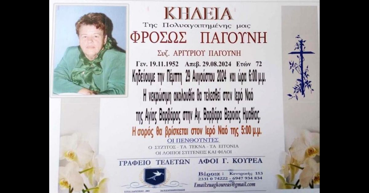 Η κηδεία της θα γίνει την Πέμπτη 29 Αυγούστου και ώρα 6:00μμ. στον Ιερό Ναό της Αγίας Βαρβάρας στην Αγία Βαρβάρα Βεροίας.
