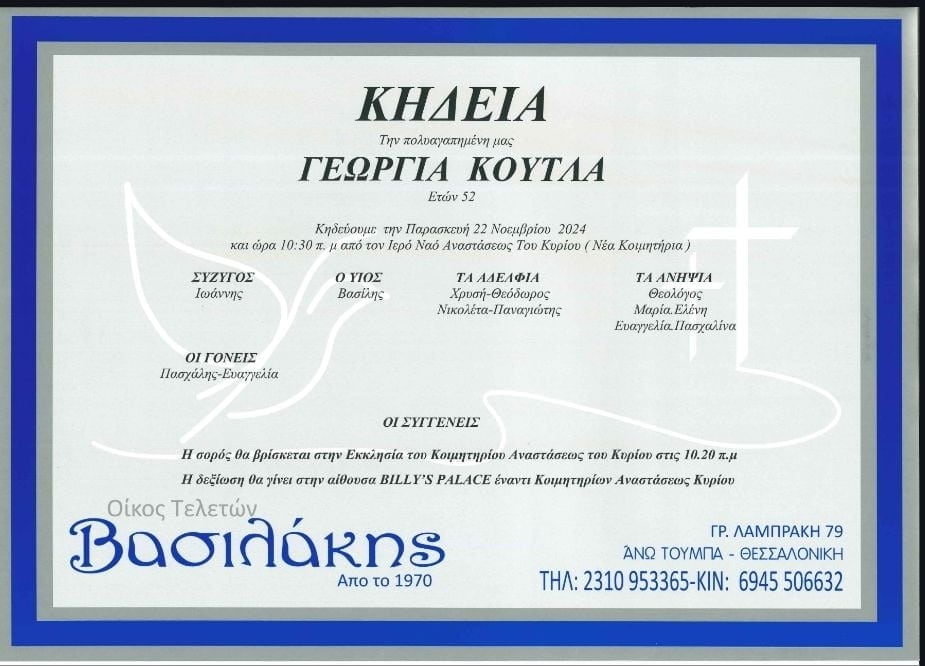 Η κηδεία της θα γίνει την Παρασκευή 22 Νοεμβρίου 2024 και ώρα 10:30π.μ. από τον Ιερό Ναό Αναστάσεως του Κυρίου στη Θεσσαλονίκη.