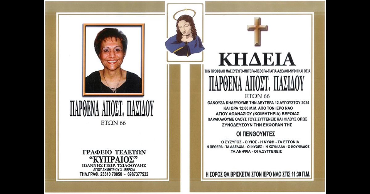 Σε ηλικία 66 ετών άφησε την τελευταία της πνοή η Πασίδου Παρθένα.