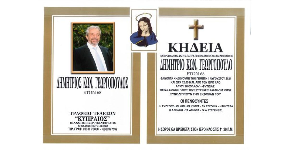 Η κηδεία του θα γίνει την Πέμπτη 1 Αυγούστου 2024 και ώρα από τον Ιερό Ναό Αγίου Νικολάου Φυτειάς.
