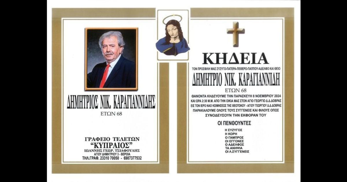 Σε ηλικία 68 ετών άφησε την τελευταία του πνοή ο Δημήτριος Καραγιαννίδης.