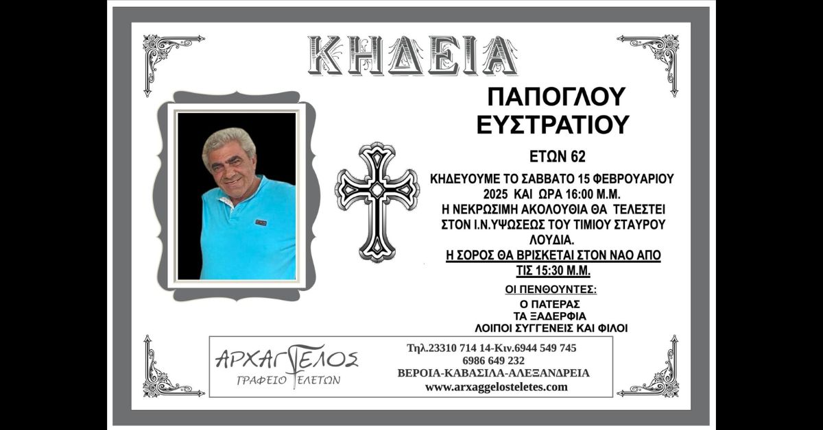 Η κηδεία του θα γίνει το Σάββατο 15 Φεβρουαρίου και ώρα 16:00μ.μ. στον Ι.Ν. Υψώσεως του Τιμίου Σταυρού Λουδία.