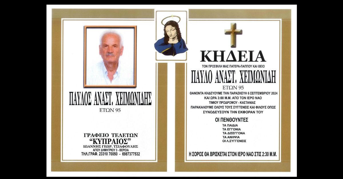 Σε ηλικία 95 ετών άφησε την τελευταία του πνοή ο Παύλος Χειμωνίδης.