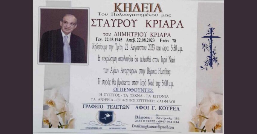 Σε ηλικία 78 ετών άφησε την τελευταία του πνοή ο Σταύρος Κριαράς.
