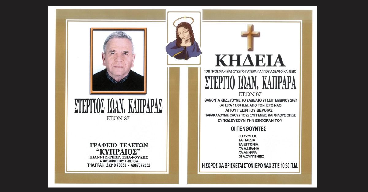 Σε ηλικία 87 ετών άφησε την τελευταία του πνοή ο Στέργιος Καπράρας.