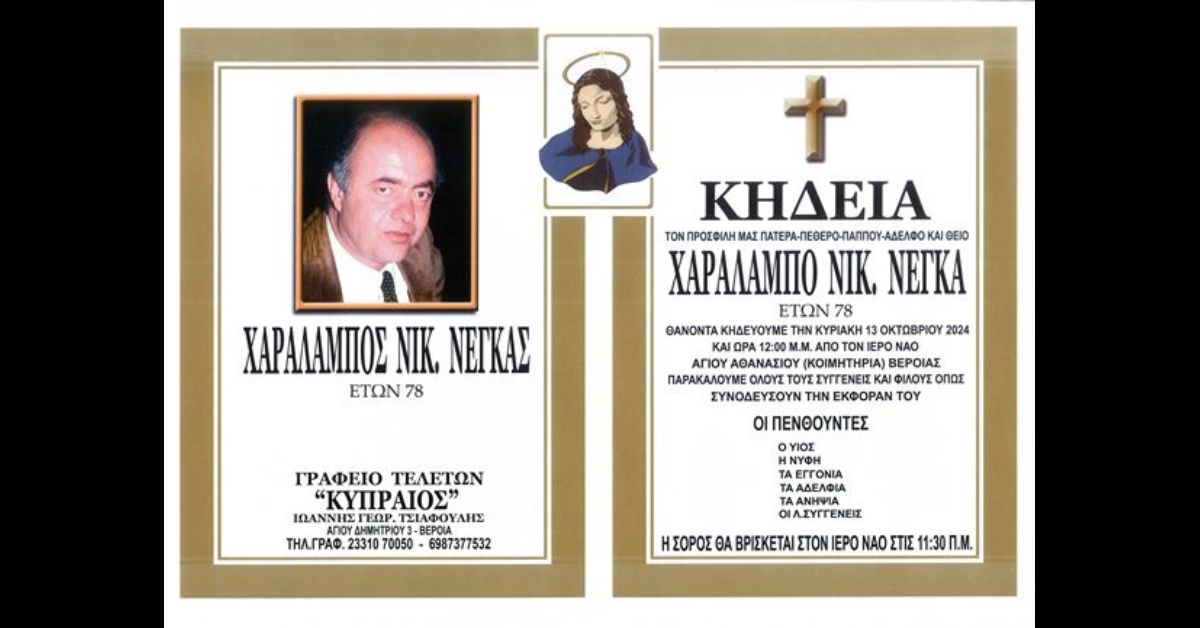 Η κηδεία του θα γίνει την Κυριακή 13 Οκτωβρίου και ώρα 12:00 μ.μ. από τον Ιερό Ναό Αγίου Αθανασίου (Κοιμητήρια) Βέροιας.