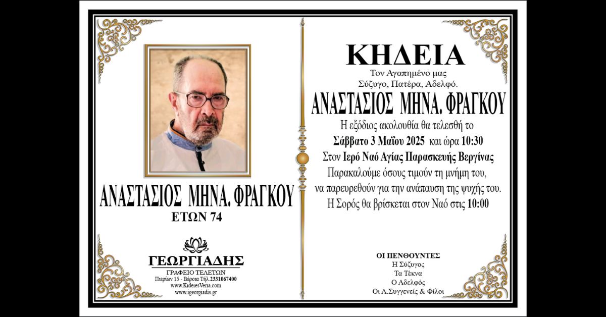 Η κηδεία του θα γίνει το Σάββατο 3 Μαΐου και ώρα 10:30 στον Ιερό Ναό Αγίας Παρασκευής στη Βεργίνα.