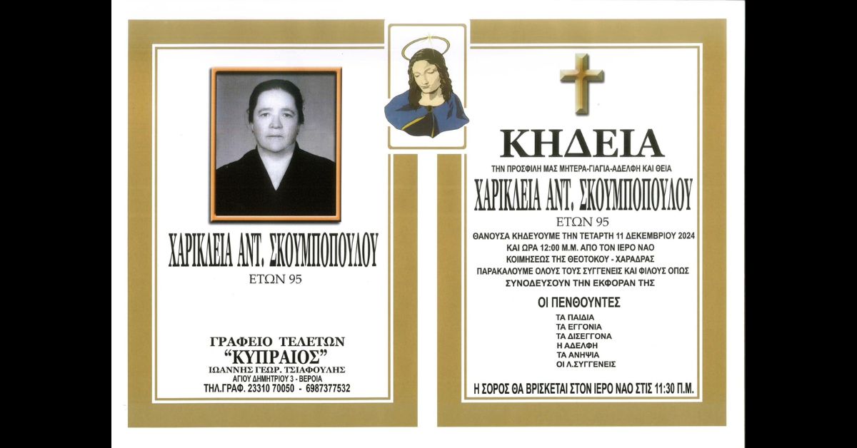 Σε ηλικία 95 ετών άφησε την τελευταία της πνοή η Χαρίκλεια Σκουμποπούλου.