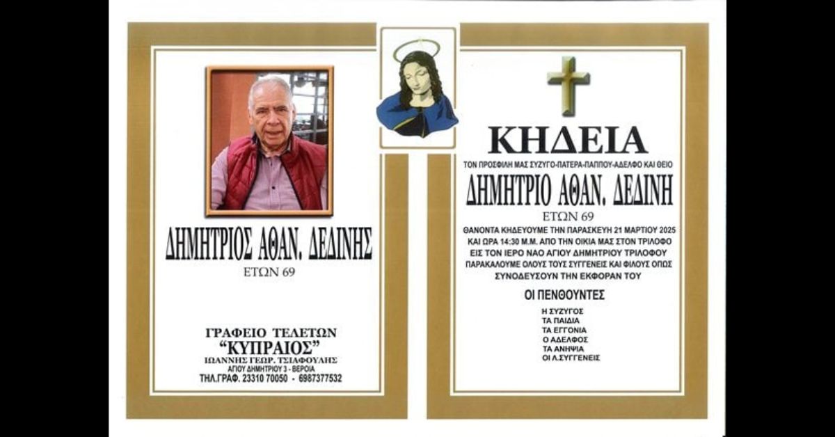 Σε ηλικία 69 ετών άφησε την τελευταία του πνοή ο Δημήτριος Δεδίνης.
