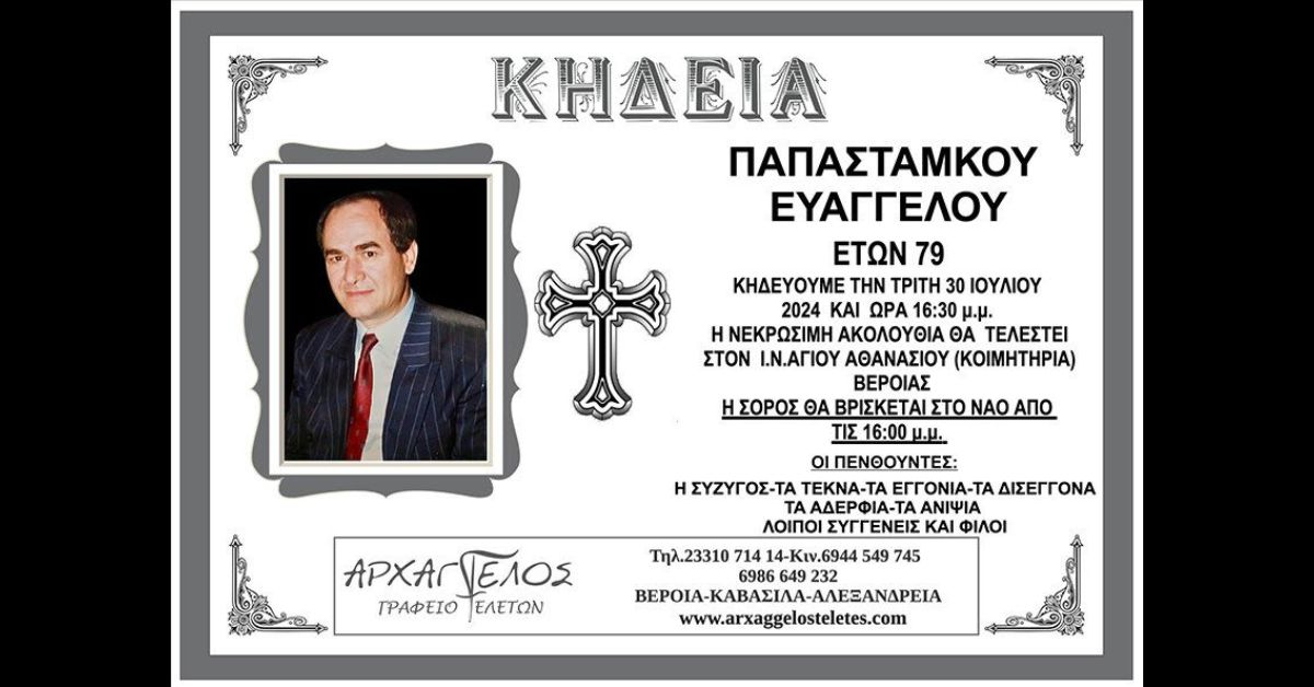 Η κηδεία του θα γίνει σήμερα Τρίτη 30 Ιουλίου και ώρα 16:30 στον Ι.Ν. Αγίου Αθανασίου στη Βέροια.