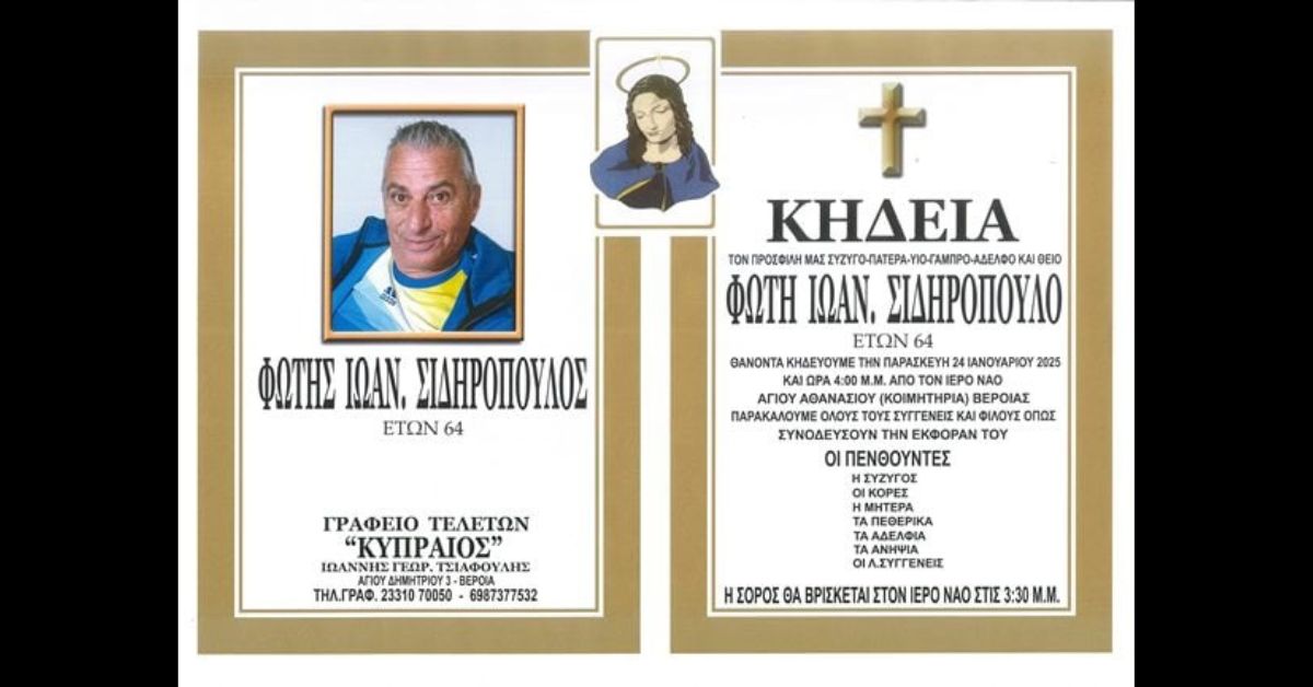 Η κηδεία του θα γίνει σήμερα Παρασκευή 24 Ιανουαρίου και ώρα 4μ.μ. από τον Ιερό Ναό Αγίου Αθανασίου (Κοιμητήρια) Βέροιας.