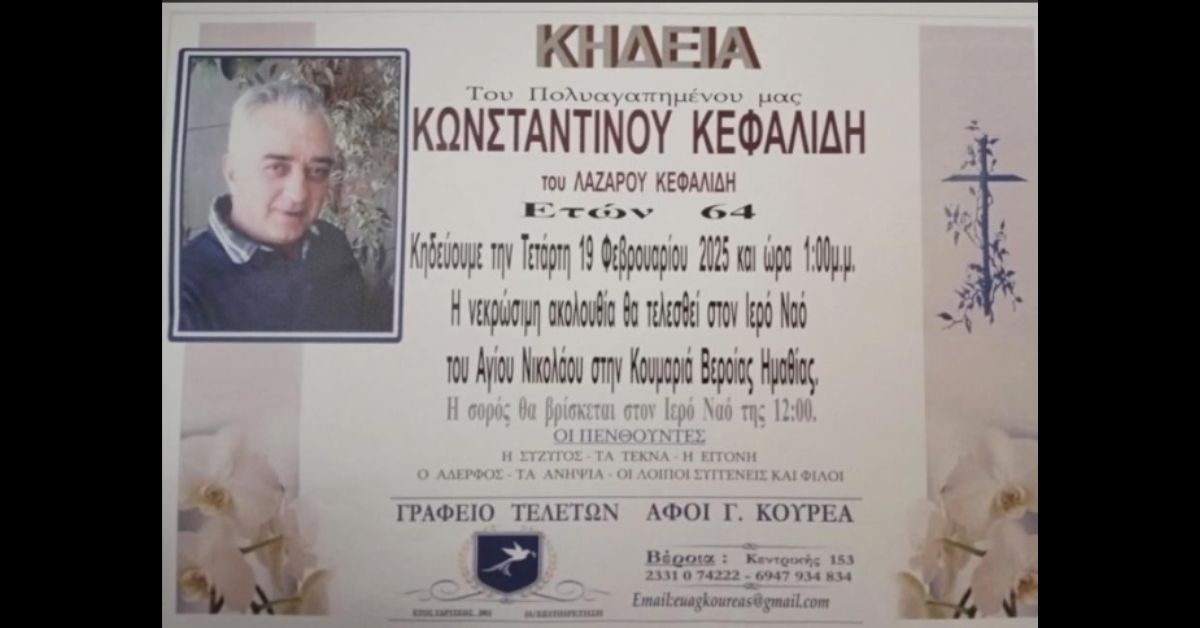 Η κηδεία του θα γίνει την Τετάρτη 19 Φεβρουαρίου και ώρα 1:00μ.μ. στον Ιερό Ναό του Αγίου Νικολάου στην Κουμαριά Βέροιας.