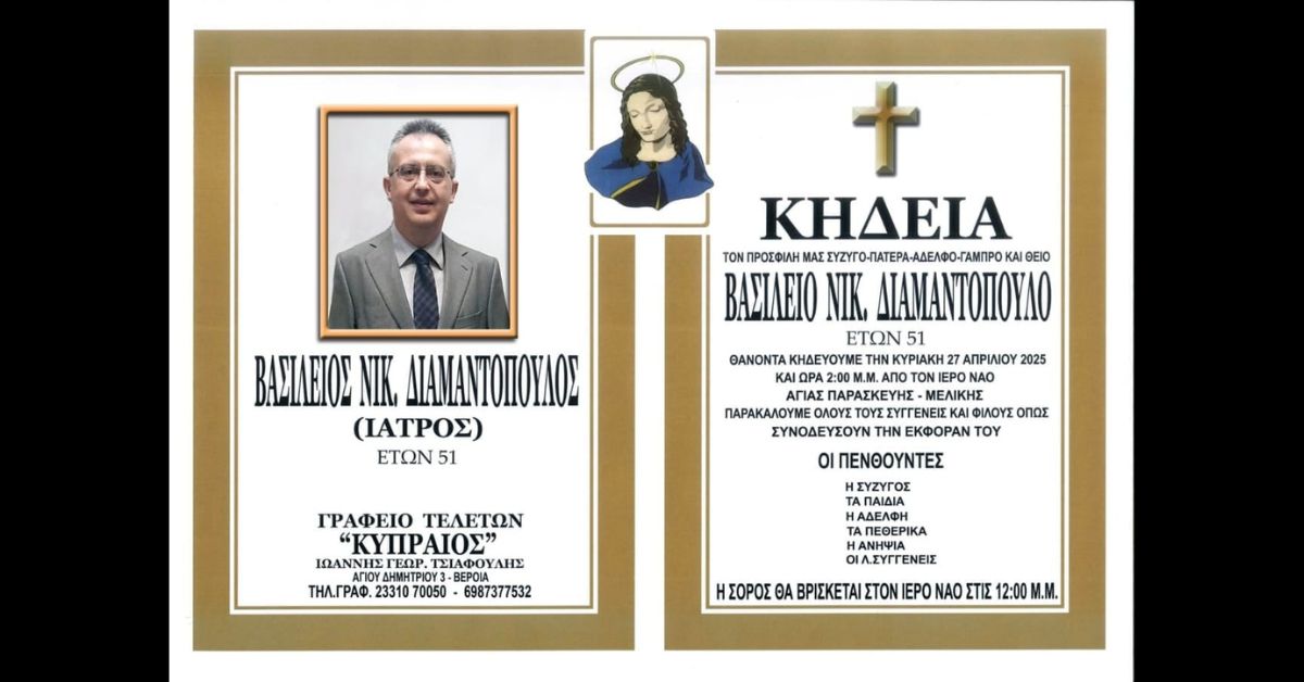 Σε ηλικία 51 ετών άφησε την τελευταία του πνοή ο Βασίλης Διαμαντόπουλος, ένας εξαιρετικός επιστήμονας, ο οποίος διετέλεσε Πρόεδρος του Ιατρικού Συλλόγου Ημαθίας.