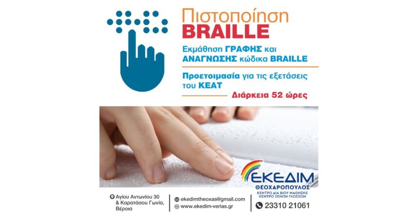 Το Κέντρο Δια Βίου Μάθησης ΕΚΕΔΙΜ ΘΕΟΧΑΡΟΠΟΥΛΟΣ , στα πλαίσια της συνεργασίας με τον Πανελλήνιο Σύνδεσμο Τυφλών, Περιφερειακή Ένωση Κεντρικής Μακεδονίας, υλοποιεί τμήματα εκμάθησης του συστήματος γραφής και ανάγνωσης Braille για τυφλούς, με σκοπό την απόκτηση πιστοποίησης.